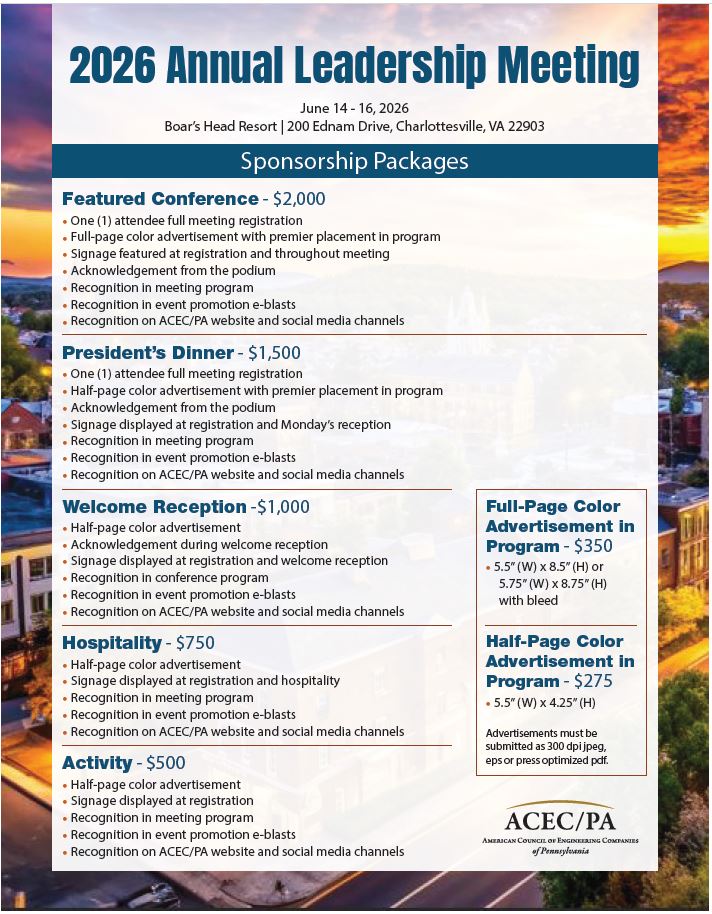 •One (1) attendee full meeting registration • Full-page color advertisement with premier placement in program • Signage featured at registration and throughout meeting • Acknowledgment from the podium • Recognition in meeting program • Recognition in event promotion e-blasts • Recognition on ACEC/PA website and social media channels |